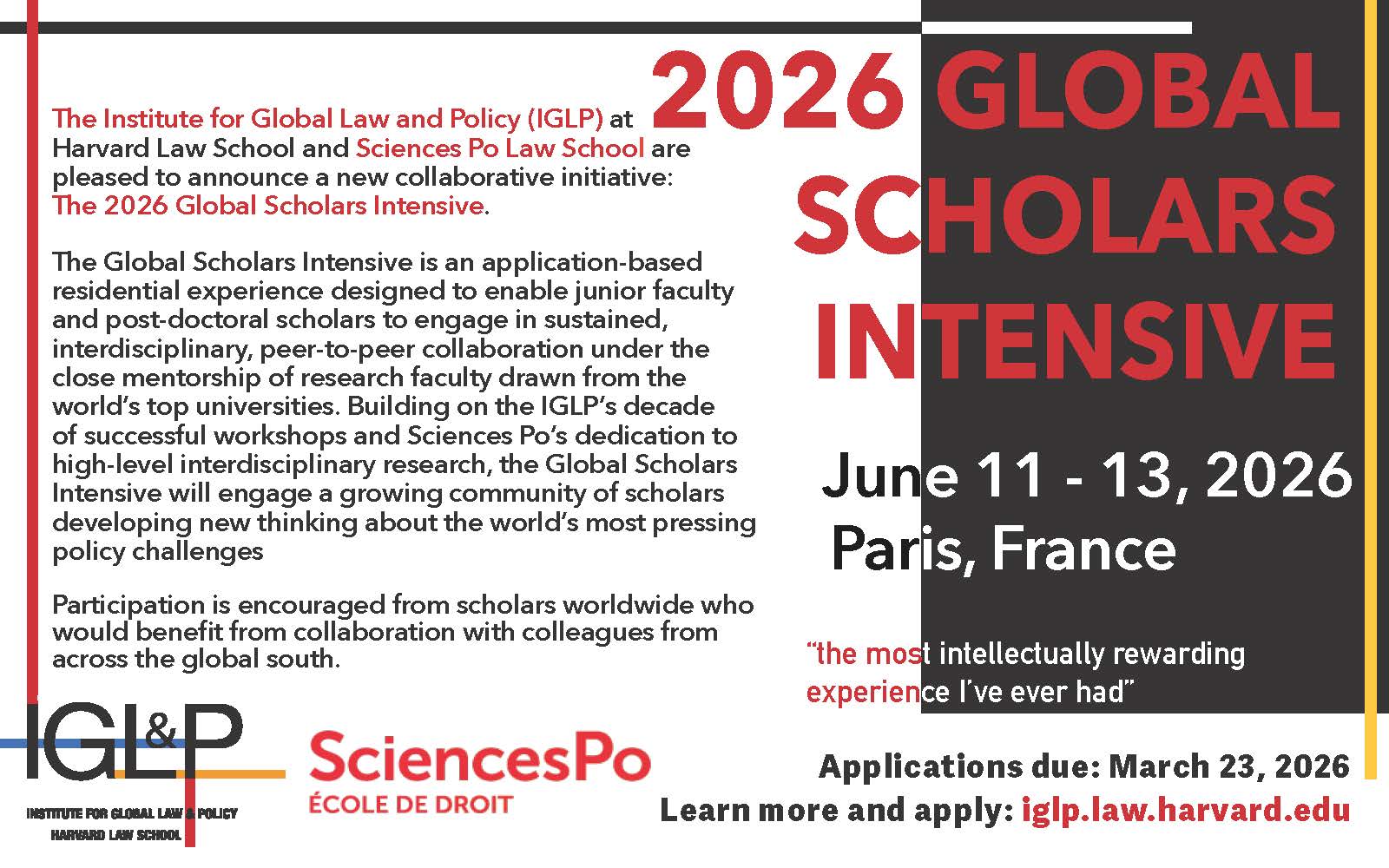 The Institute for Global Law and Policy at Harvard Law School is pleased to announce the 2026 Global Scholars Intensive organized in collaboration with Sciences Po Law School. The Intensive, to be held in Paris, France from June 11 – 13, 2026, is a focused three-day residential experience designed to enable junior faculty and post-doctoral scholars to engage in sustained, interdisciplinary, peer-to-peer collaboration under the